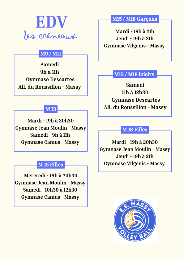Ecole de volley – Créneaux / Tarifs 2025-2026 0 Par Margaux Gardet le 1 août 2025 Ecole de Volley, Information Pour cette nouvelle saison, voici les créneaux d’entrainements pour les différentes sections jeunes de l’école de volley, ainsi que les tarifs associés Share. Twitter Facebook Google+ Pinterest LinkedIn Tumblr Email